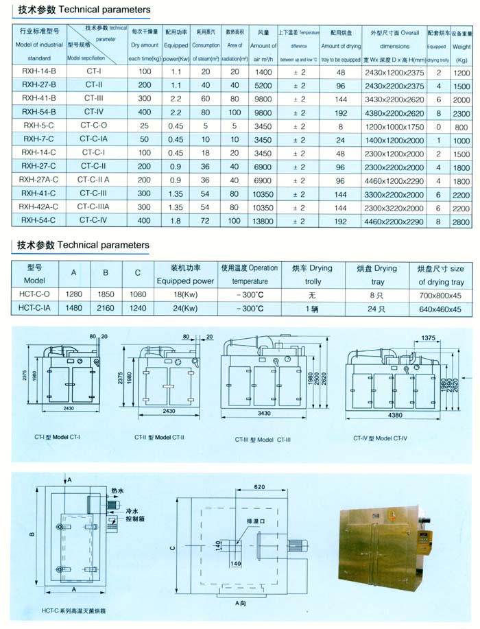 CT-C型系列热风循环烘箱配用低噪音耐高温轴流风机和自动控温系统,整个循环系统全封闭,使烘箱的热效率从传统的烘房3-7%提高到目前的35-45%,较高热效率可达50%。CT-C型热风循环烘箱的设计成功,使我国的热风循环烘箱达到了国内外先进水平。为我国节约了大量能源,提高了企业的经济效益。1990年由国家医药管理局发布了行为标准,统一型号为RXH。