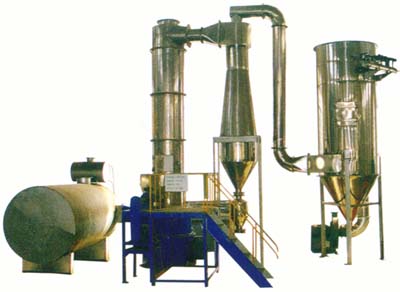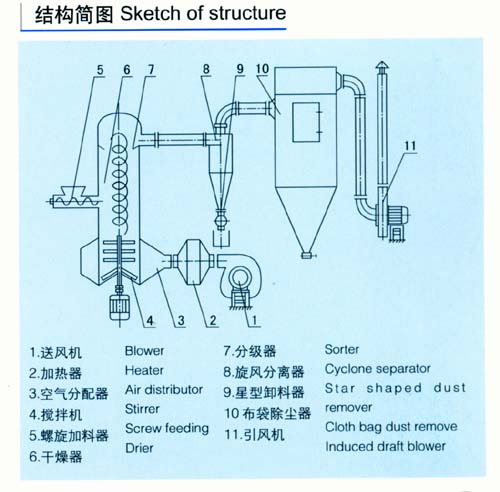 热空气切线进入干燥器底部,在搅拌器带动下形成强有力的旋转风场。膏状物料由螺旋加料器进入干燥器内,在高速旋转搅拌桨的强烈作用下,物料受撞击、磨擦及剪切的作用下得到分散,块状物料迅速粉碎,与热空气充分接触、受热、干燥。脱水后的干物料随热气流上升,分级环将大颗粒截留,小颗粒从环中心排出干燥器外,由旋风分离器和除尘器回收,未干透或大块物料受离心力作用甩向器壁,重新落到底部被粉碎干燥。