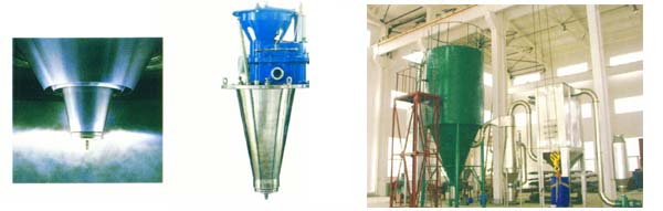 空气经过滤和加热,进入干燥器顶部空气分配器,热空气呈螺旋状均匀地进入干燥室。料液经塔体顶部的高速离心雾化器,(旋转)喷雾成极细微的雾状液珠,与热空气并流接触在极短的时间内可干燥为成品。成品连续地由干燥塔底部和旋风分离器中输出,废气由风机排空。
