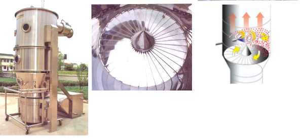 ※LBF 旋流流化床制粒包衣机是将流化床做成叶片式结构的流化床,并使叶片呈一定斜度,让气流从叶片的间隙通过,形成环流状的强大气流,使物料呈旋涡状似的有序运动,同时安装在侧壁的气动喷嘴将粘合剂或包衣液喷入呈旋涡状的物料层,从而将粉体制成颗粒或获得连续均匀的衣膜。