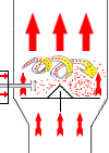 粉末或者目力在旋转流化床内,受到环隙空气浮力,旋转离心力、自身中力作用,呈环周绳股状,粘和剂或包衣液喷入料层形成真球度及高的丸粒或连续均匀的衣膜。